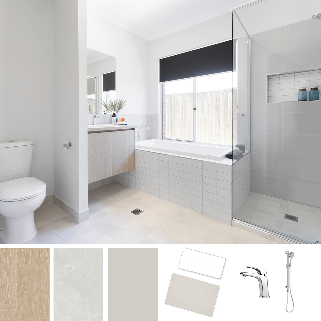The light timber cupboards along with textures of white and grey tones in the tile selection creates a bright and modern room. Follow along as we break down all the colour choices. ‘Agrestic White Satin’ have a wave to the short, rectangular shape and the satin finish gives an almost matte texture when contrasted with the ‘Uni Light Grey Gloss’ used along the walls and shower spaces. ‘Warehouse White’ is featured throughout the Crawford 23 display flooring, providing a stone-like look.