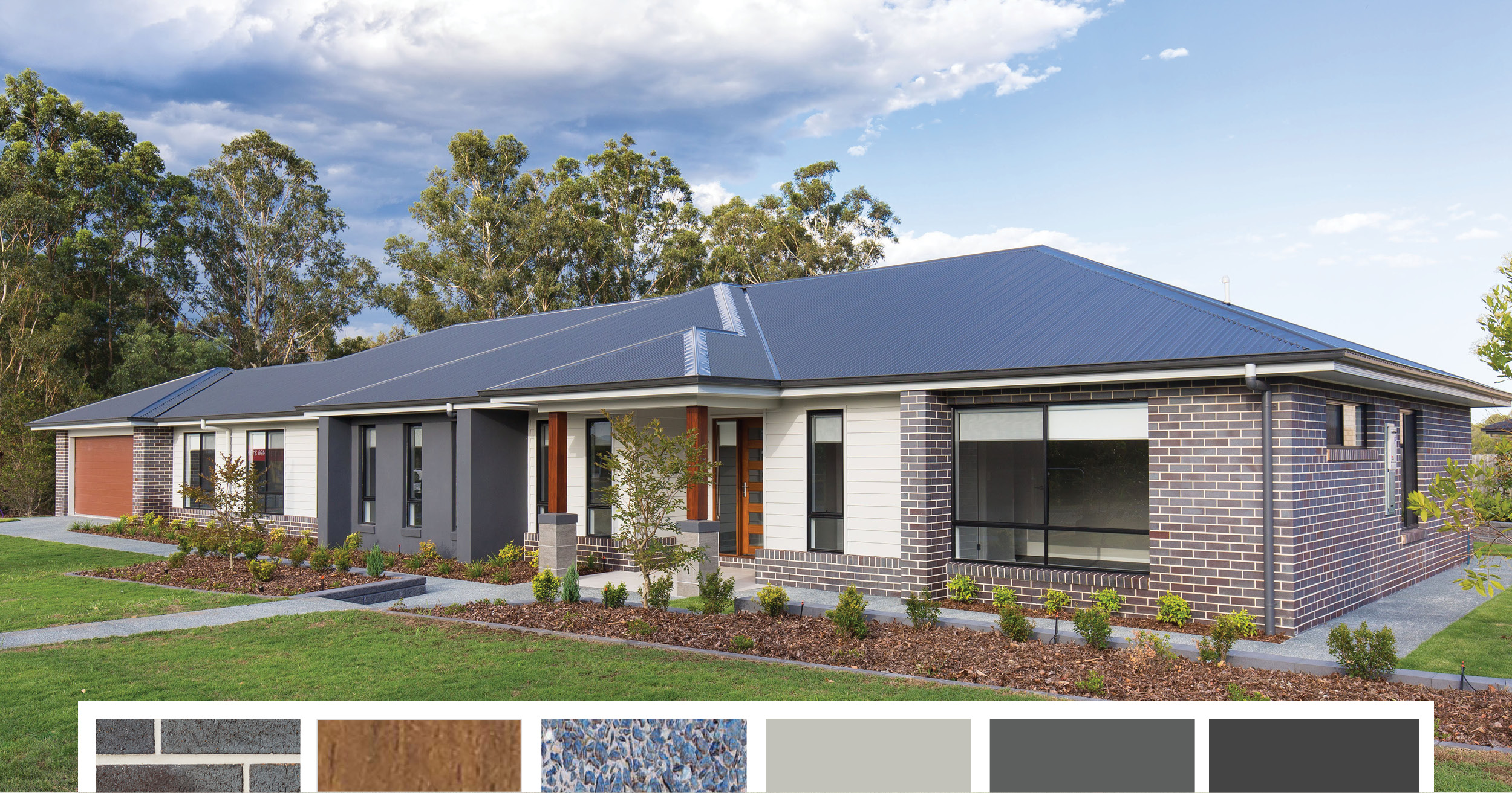 Our Delaney 39 Modern display home based in Delaney’s Creek is a perfect example of this colour and texture combination. Using brick, render and cladding, this façade takes a modern approach with a colour scheme that sits dark, yet neutral. This wide, acreage home design gets a sense of character, warmth and hominess out of the materials and colour palette chosen.