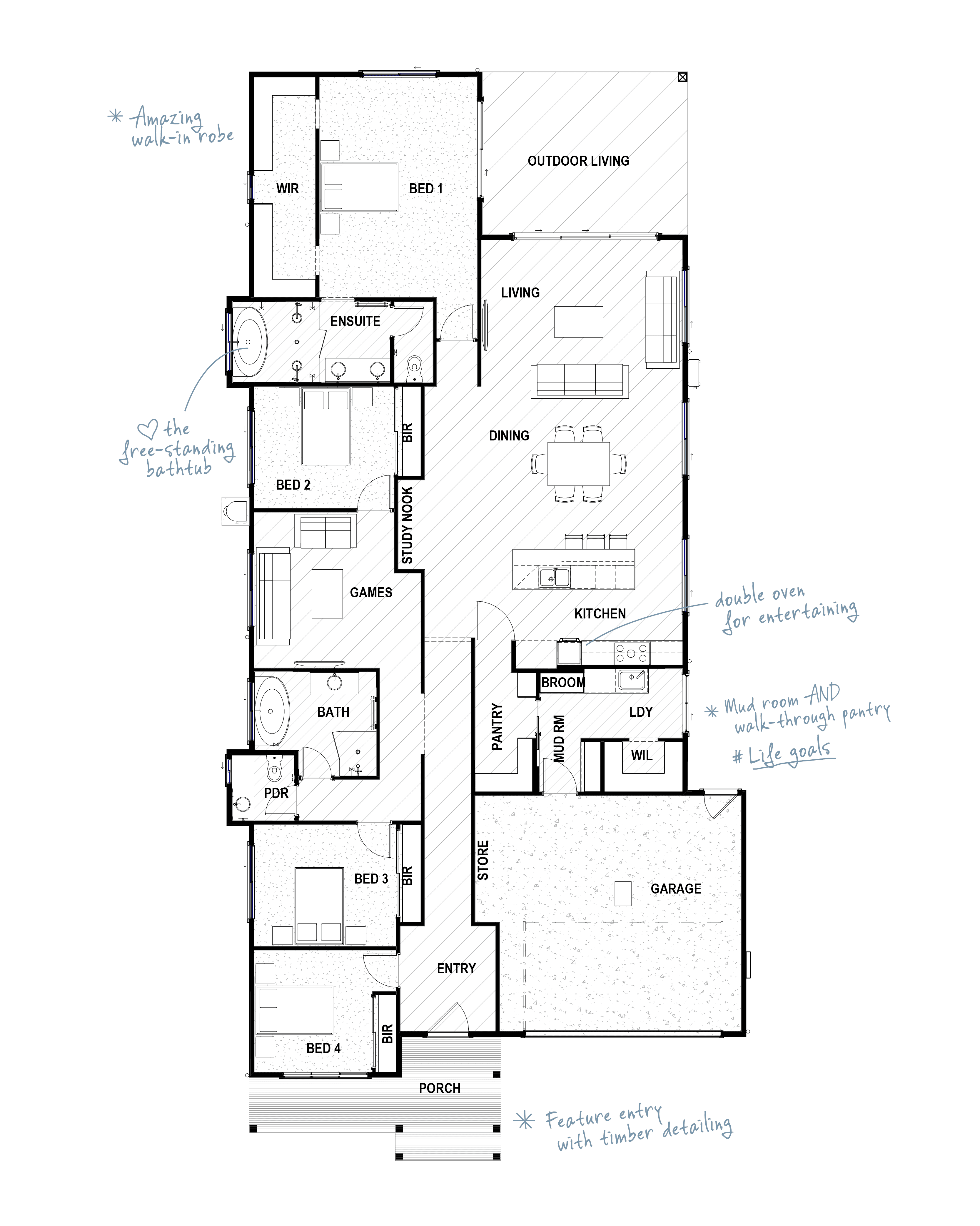 Capturing effortless modern coastal style, this spacious home inspires relaxed, cruisy living at every turn. Cleverly incorporating a mud room, walk-through pantry, and bags of storage, the Whitehaven is designed to deliver the ‘calm in the chaos’ of day-to-day family life.