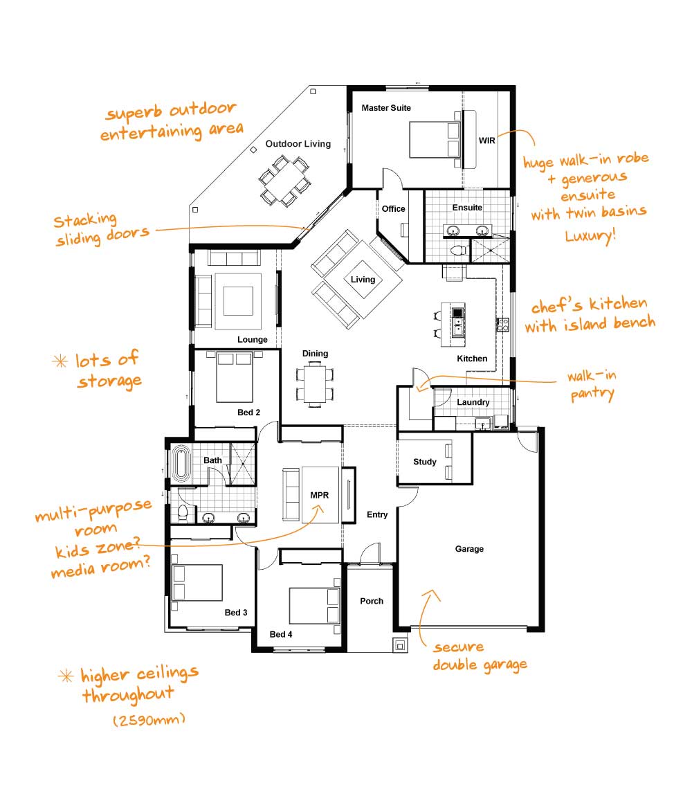 CALL 3801 1328 SEND US AN EMAILFloor plan prepared before construction. Floor plan is illustrative and indicative only. Finished product may differ from floor plan. Whilst every care is taken, no warranty is given or representation is made as to the accuracy or completeness of the information in the floor plan. Prospective buyers should refer to contract documents and should seek and rely on their own advice. All images and renders are indicative only, and the pricing on this website does not include as standard, all external landscaping including clothesline, fencing, driveway and letterbox. As this is impacted by the size of the block, these costs are excluded. Furniture shown is not included. For detailed home pricing please speak to one of our Home Coaches today. 'Nominated block widths are indicative only. Setbacks vary on different estates, please make your own enquiries regarding applicable building setbacks.