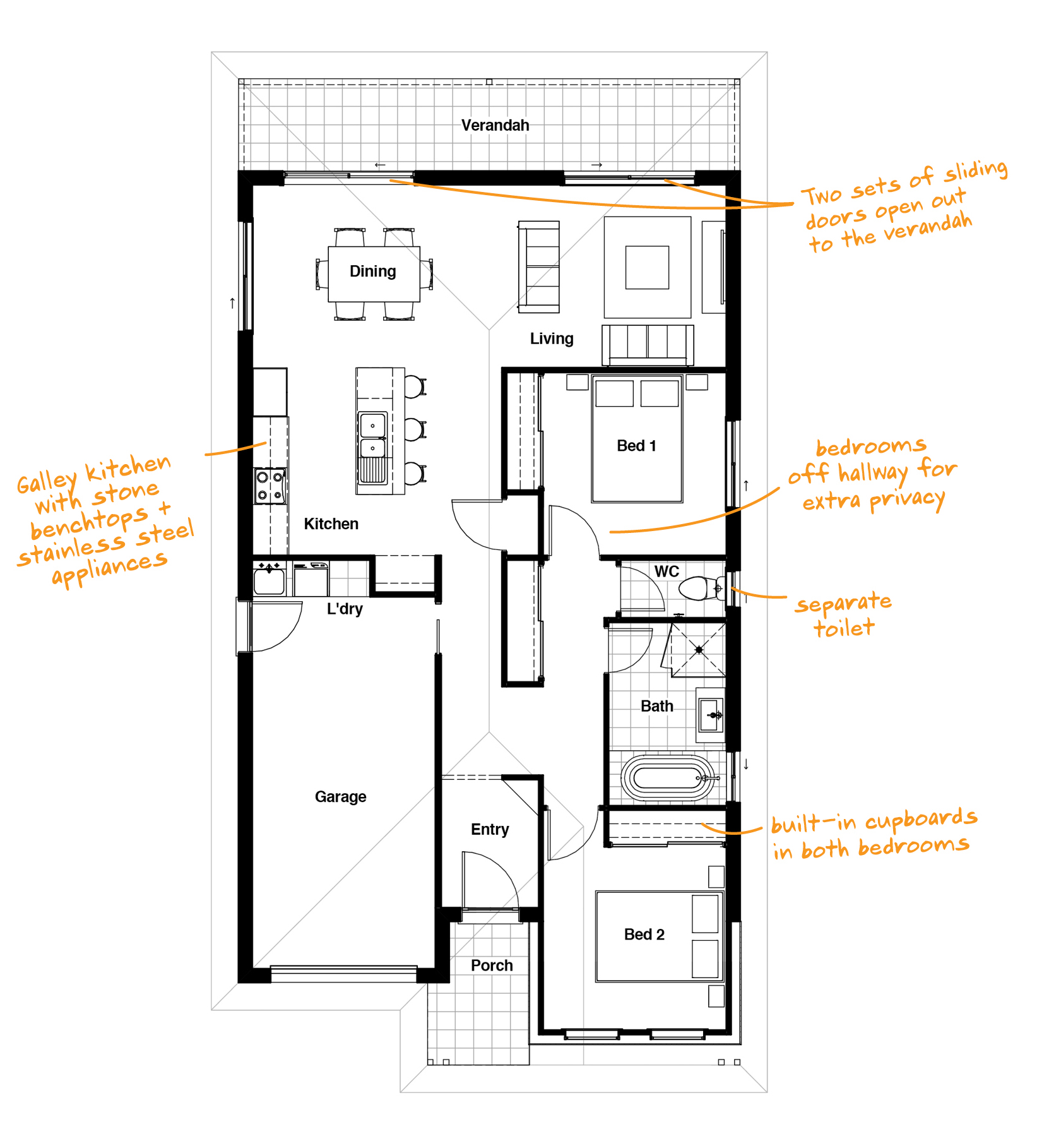 This cleverly designed cottage with a compact footprint is ideal for downsizers or those just starting out. A beautiful open plan living zone flows onto the rear verandah, perfect for relaxing meals and evenings with friends.