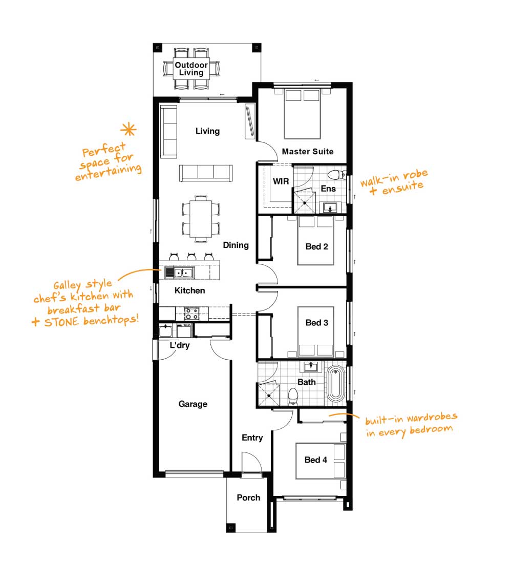 CALL 3801 1328 SEND US AN EMAILFloor plan prepared before construction. Floor plan is illustrative and indicative only. Finished product may differ from floor plan. Whilst every care is taken, no warranty is given or representation is made as to the accuracy or completeness of the information in the floor plan. Prospective buyers should refer to contract documents and should seek and rely on their own advice. All images and renders are indicative only, and the pricing on this website does not include as standard, all external landscaping including clothesline, fencing, driveway and letterbox. As this is impacted by the size of the block, these costs are excluded. Furniture shown is not included. For detailed home pricing please speak to one of our Home Coaches today. 'Nominated block widths are indicative only. Setbacks vary on different estates, please make your own enquiries regarding applicable building setbacks.