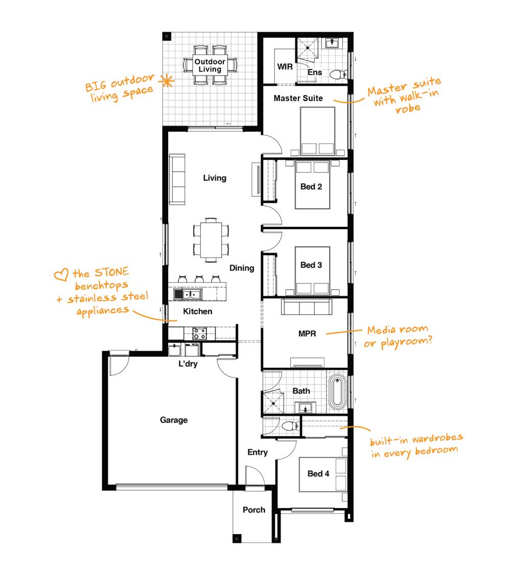 CALL 3801 1328 SEND US AN EMAILFloor plan prepared before construction. Floor plan is illustrative and indicative only. Finished product may differ from floor plan. Whilst every care is taken, no warranty is given or representation is made as to the accuracy or completeness of the information in the floor plan. Prospective buyers should refer to contract documents and should seek and rely on their own advice. All images and renders are indicative only, and the pricing on this website does not include as standard, all external landscaping including clothesline, fencing, driveway and letterbox. As this is impacted by the size of the block, these costs are excluded. Furniture shown is not included. For detailed home pricing please speak to one of our Home Coaches today. 'Nominated block widths are indicative only. Setbacks vary on different estates, please make your own enquiries regarding applicable building setbacks.