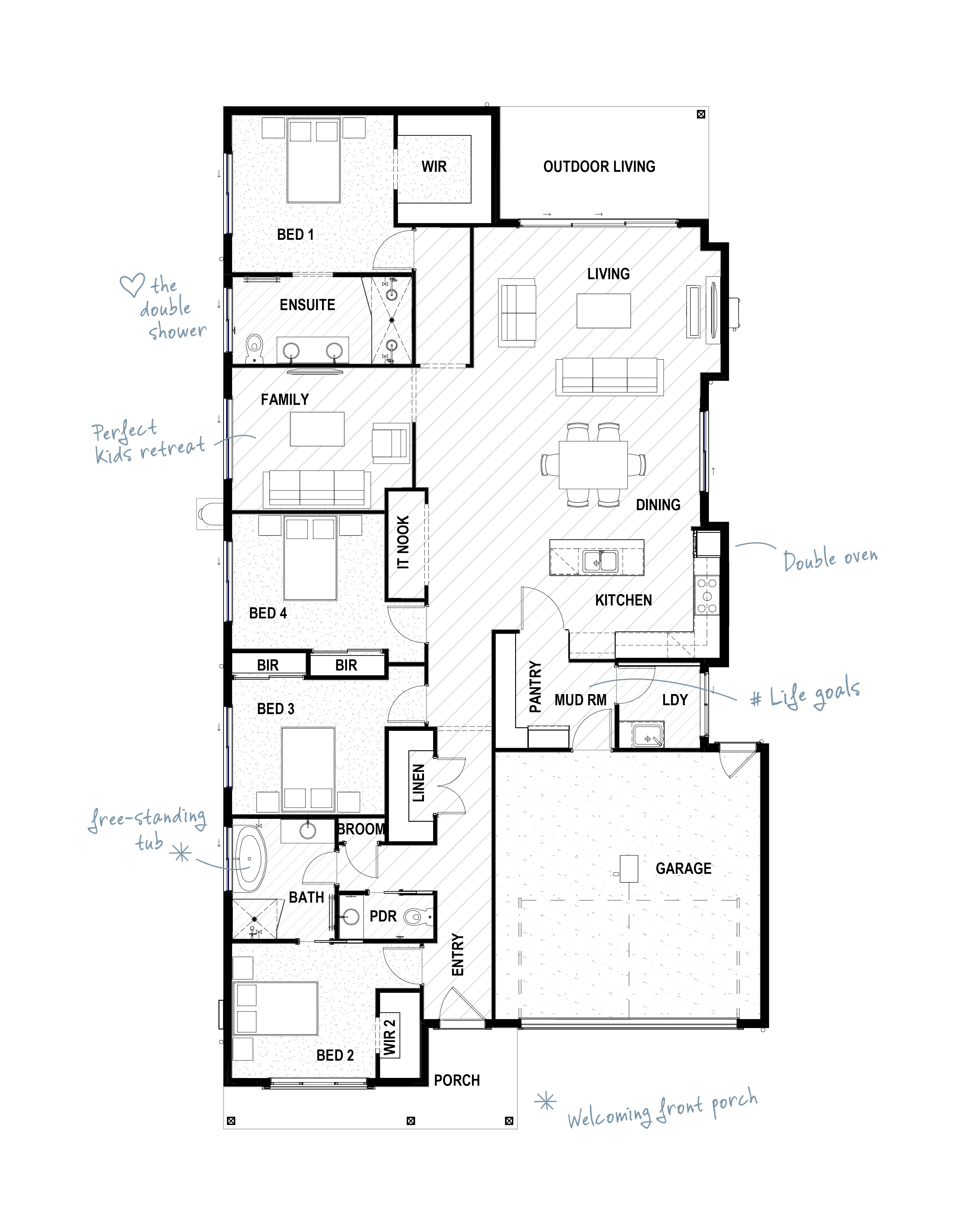 CALL 3801 1328 SEND US AN EMAILFloor plan prepared before construction. Floor plan is illustrative and indicative only. Finished product may differ from floor plan. Whilst every care is taken, no warranty is given or representation is made as to the accuracy or completeness of the information in the floor plan. Prospective buyers should refer to contract documents and should seek and rely on their own advice. All images and renders are indicative only, and the pricing on this website does not include as standard, all external landscaping including clothesline, fencing, driveway and letterbox. As this is impacted by the size of the block, these costs are excluded. Furniture shown is not included. For detailed home pricing please speak to one of our Home Coaches today. 'Nominated block widths are indicative only. Setbacks vary on different estates, please make your own enquiries regarding applicable building setbacks.
