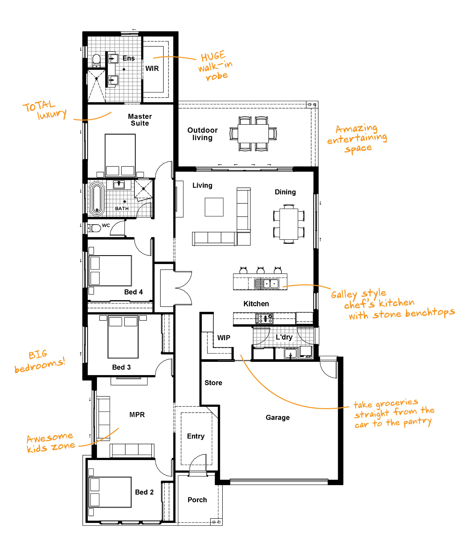 CALL 3801 1328 SEND US AN EMAILFloor plan prepared before construction. Floor plan is illustrative and indicative only. Finished product may differ from floor plan. Whilst every care is taken, no warranty is given or representation is made as to the accuracy or completeness of the information in the floor plan. Prospective buyers should refer to contract documents and should seek and rely on their own advice. All images and renders are indicative only, and the pricing on this website does not include as standard, all external landscaping including clothesline, fencing, driveway and letterbox. As this is impacted by the size of the block, these costs are excluded. Furniture shown is not included. For detailed home pricing please speak to one of our Home Coaches today. 'Nominated block widths are indicative only. Setbacks vary on different estates, please make your own enquiries regarding applicable building setbacks.
