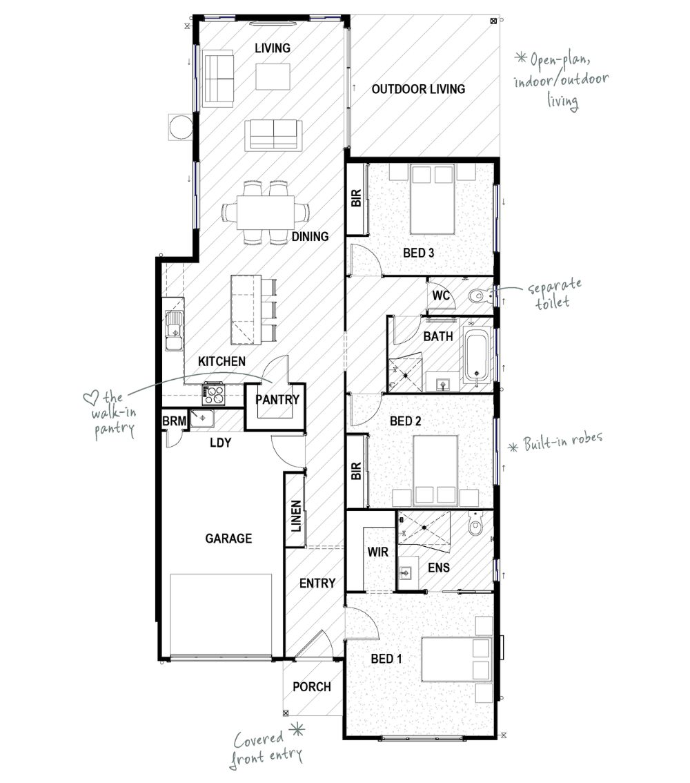 CALL 3801 1328 SEND US AN EMAILFloor plan prepared before construction. Floor plan is illustrative and indicative only. Finished product may differ from floor plan. Whilst every care is taken, no warranty is given or representation is made as to the accuracy or completeness of the information in the floor plan. Prospective buyers should refer to contract documents and should seek and rely on their own advice. All images and renders are indicative only, and the pricing on this website does not include as standard, all external landscaping including clothesline, fencing, driveway and letterbox. As this is impacted by the size of the block, these costs are excluded. Furniture shown is not included. For detailed home pricing please speak to one of our Home Coaches today. 'Nominated block widths are indicative only. Setbacks vary on different estates, please make your own enquiries regarding applicable building setbacks.